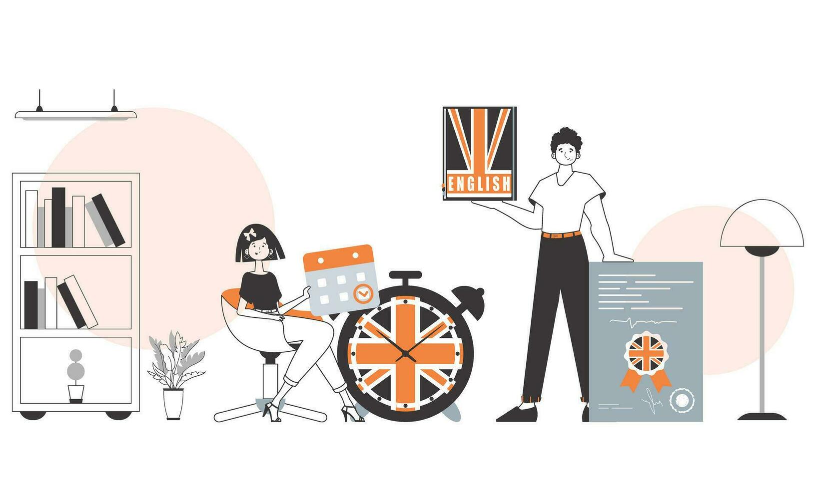 The team helps teach English. The concept of learning a foreign language. Linear modern style. Pro Vector