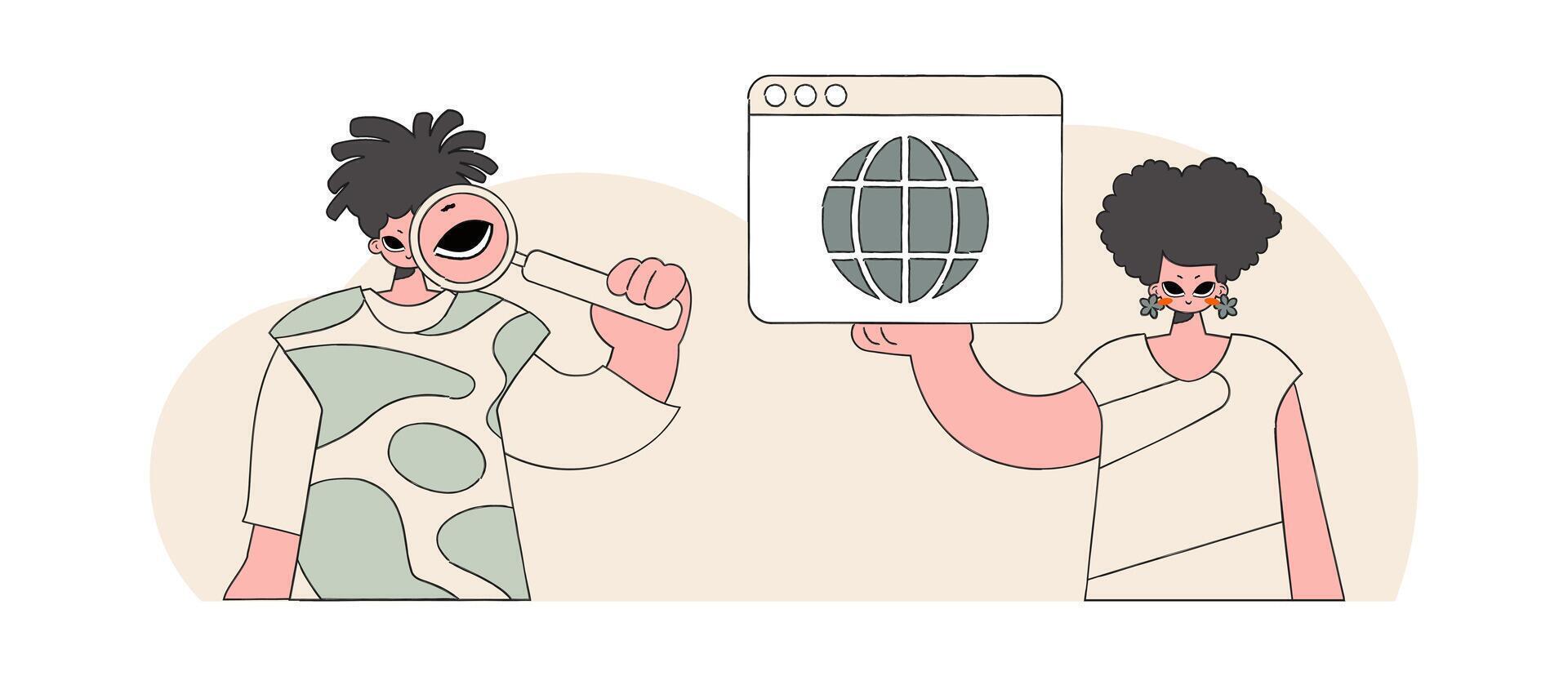 A bright and stylish illustration of a woman and a man help to find information on the Internet. Marketing materials. Perfect for adding a modern and tech touch to your project. Pro Vector