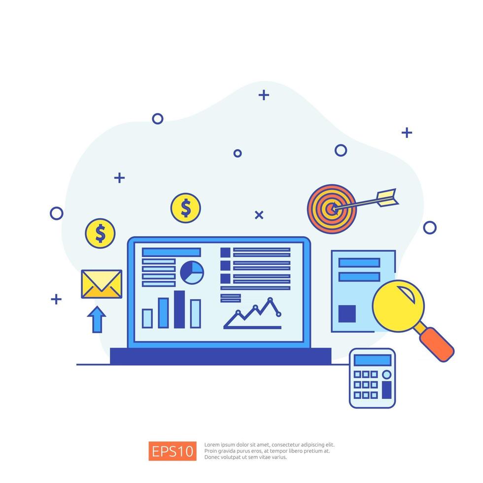 marketing concept with document data report. business statistics, investment analysis, planning research and finance audit with paper sheet chart, laptop, magnifier, paperwork, charts, graphs element Pro Vector
