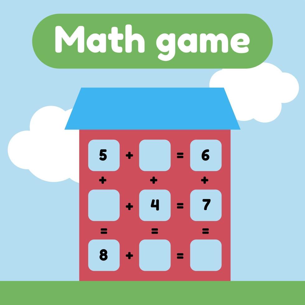 Vector illustration. Math game for preschool and school age children. Count and insert the correct numbers. Addition. House with windows. Pro Vector