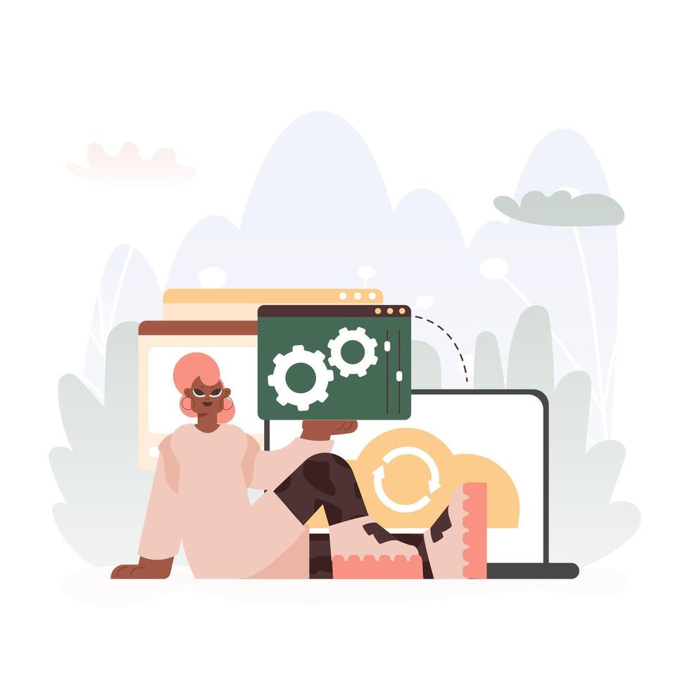 A Vector Outline of a Young lady Holding a Browser Window with Gears and Torque, Idealize for Tech and Development Concepts. Pro Vector