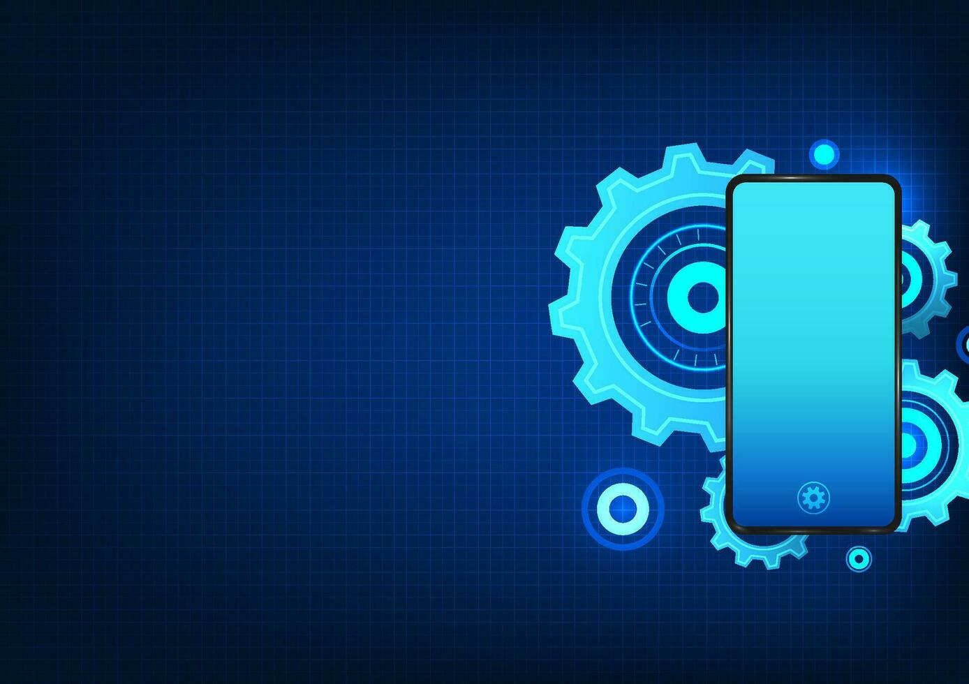 Smartphone technology Mobile phone with many gears on the back It shows that smartphone technology is continuously evolving to meet the needs of users. both entertainment and work Pro Vector