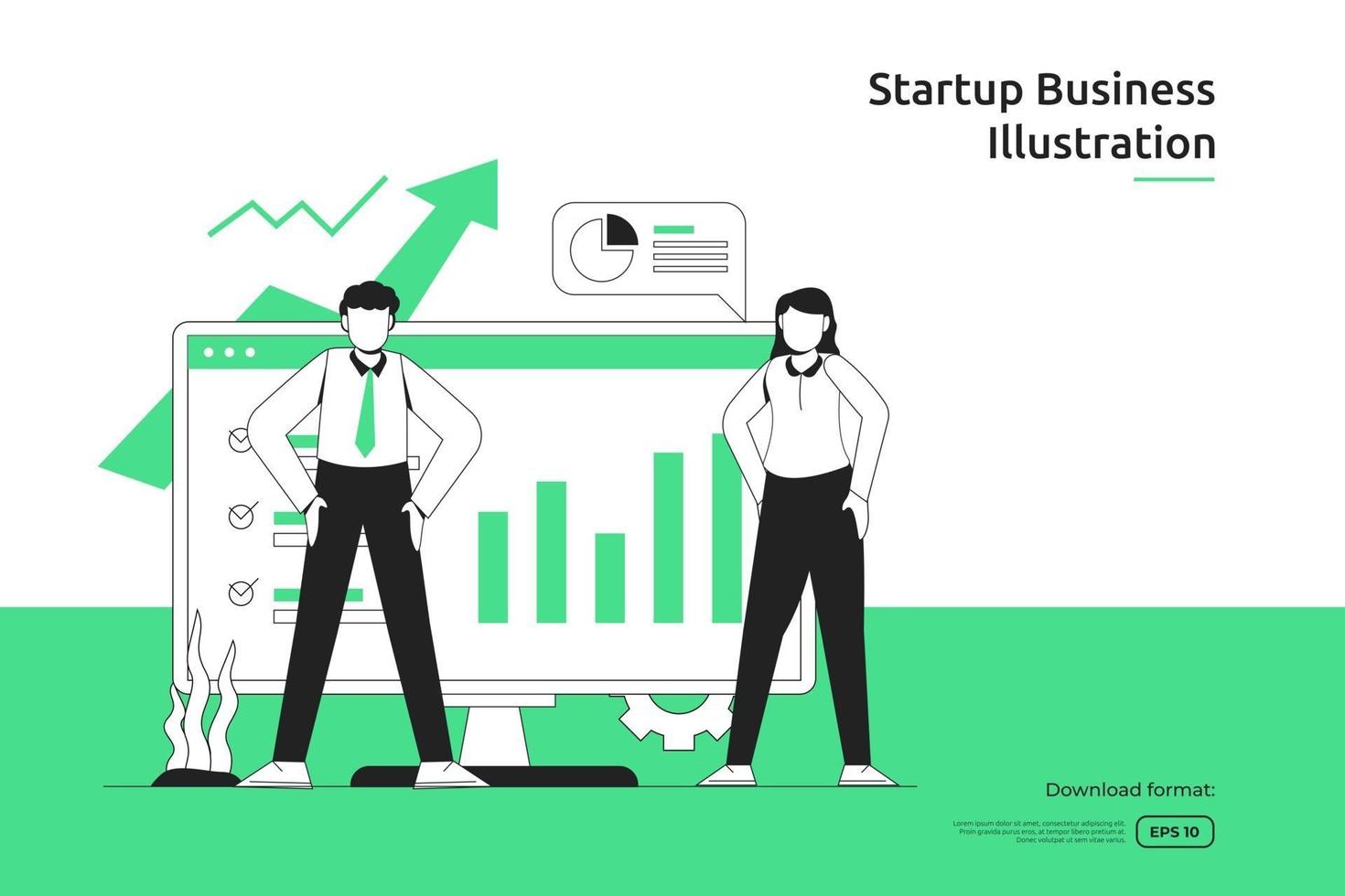business growth success with arrow up graph on computer screen and people character illustration. startup and investment venture concept. teamwork metaphor design web landing page or mobile website Pro Vector