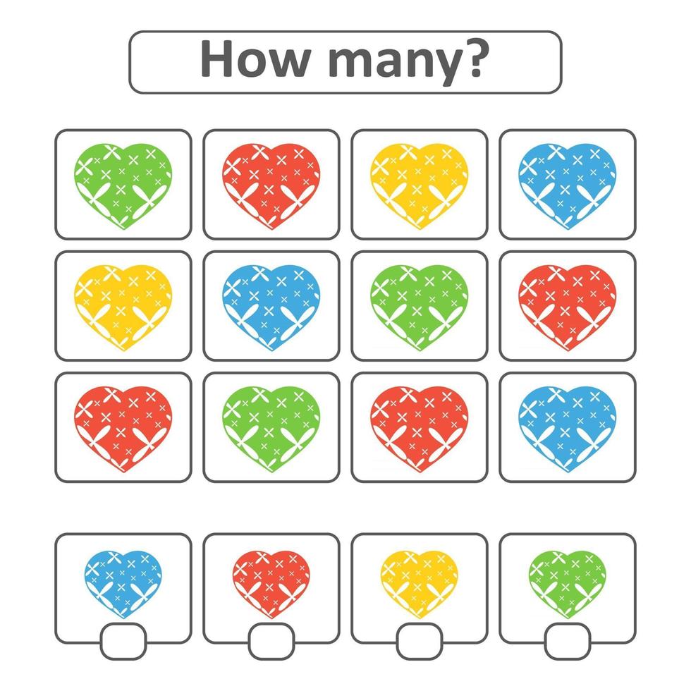 Game for preschool children. Count as many hearts in the picture and write down the result. With a place for answers. Simple flat isolated vector illustration. Pro Vector