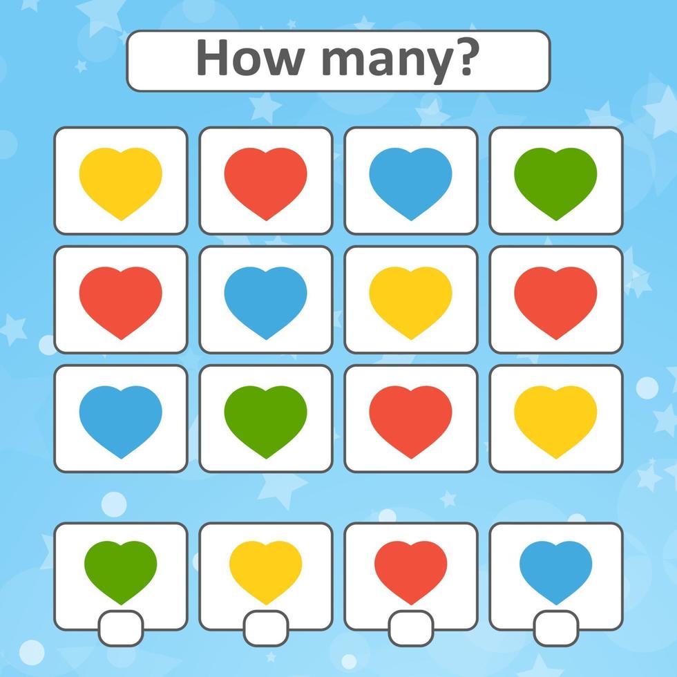 Game for preschool children. Count as many hearts in the picture and write down the result. With a place for answers. Simple flat isolated vector illustration. Pro Vector
