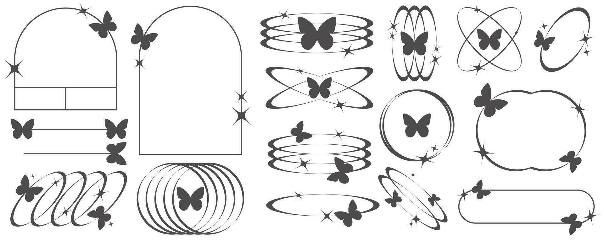 Aesthetic frames and shapes with butterflies. Minimal y2k outline graphic design with sparkles. Abstract minimalistic arches borders. Trendy boho geometric templates set. Vector illustration. Pro Vector