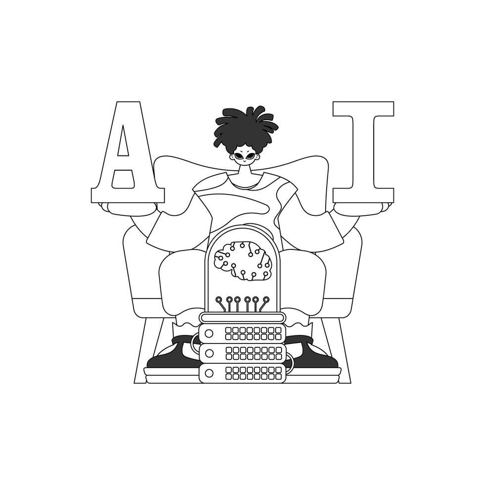 He grasps the symbols for AI, a design for AI in a line vector look Pro Vector