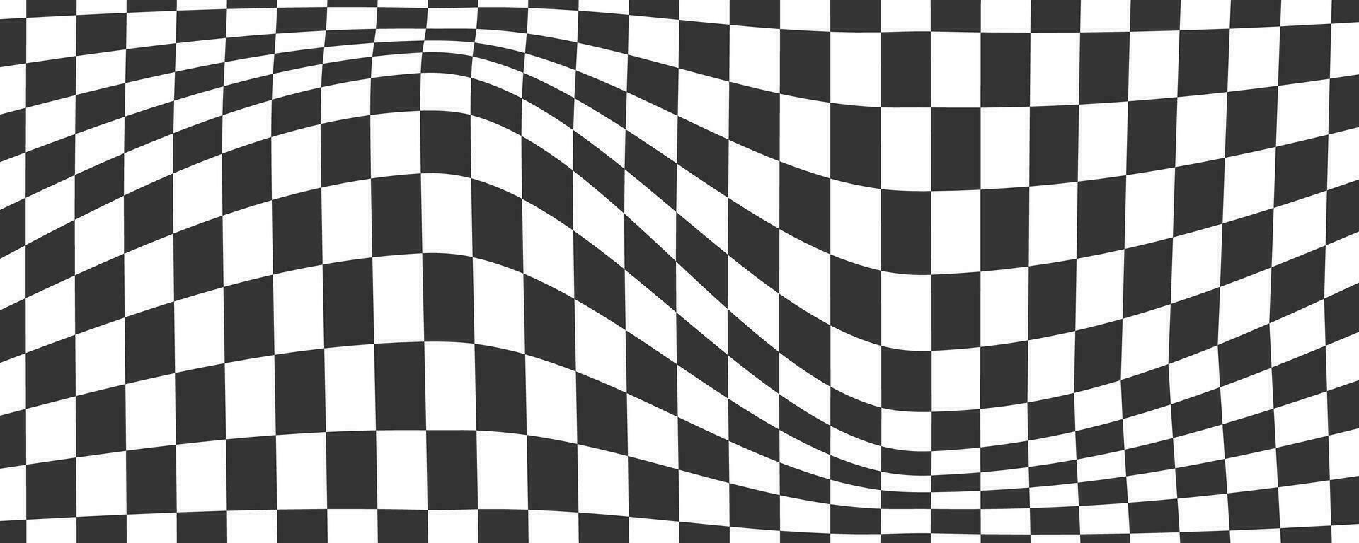 Checkerboard wavy pattern. Abstract chess square print. Black and white psychedelic optical illusion. Warped flag with geometric graphic. Y2k design for banner Pro Vector