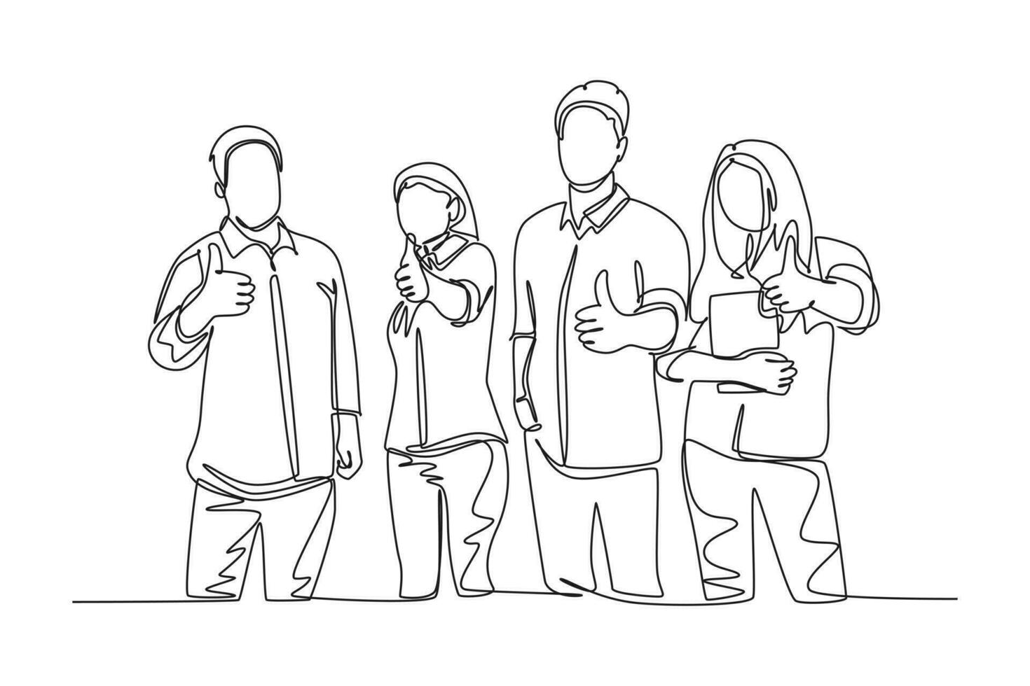 Single continuous line drawing group of happy college students giving thumbs up gesture after studying together at campus library. Learn and study in university life. One line draw vector illustration Pro Vector