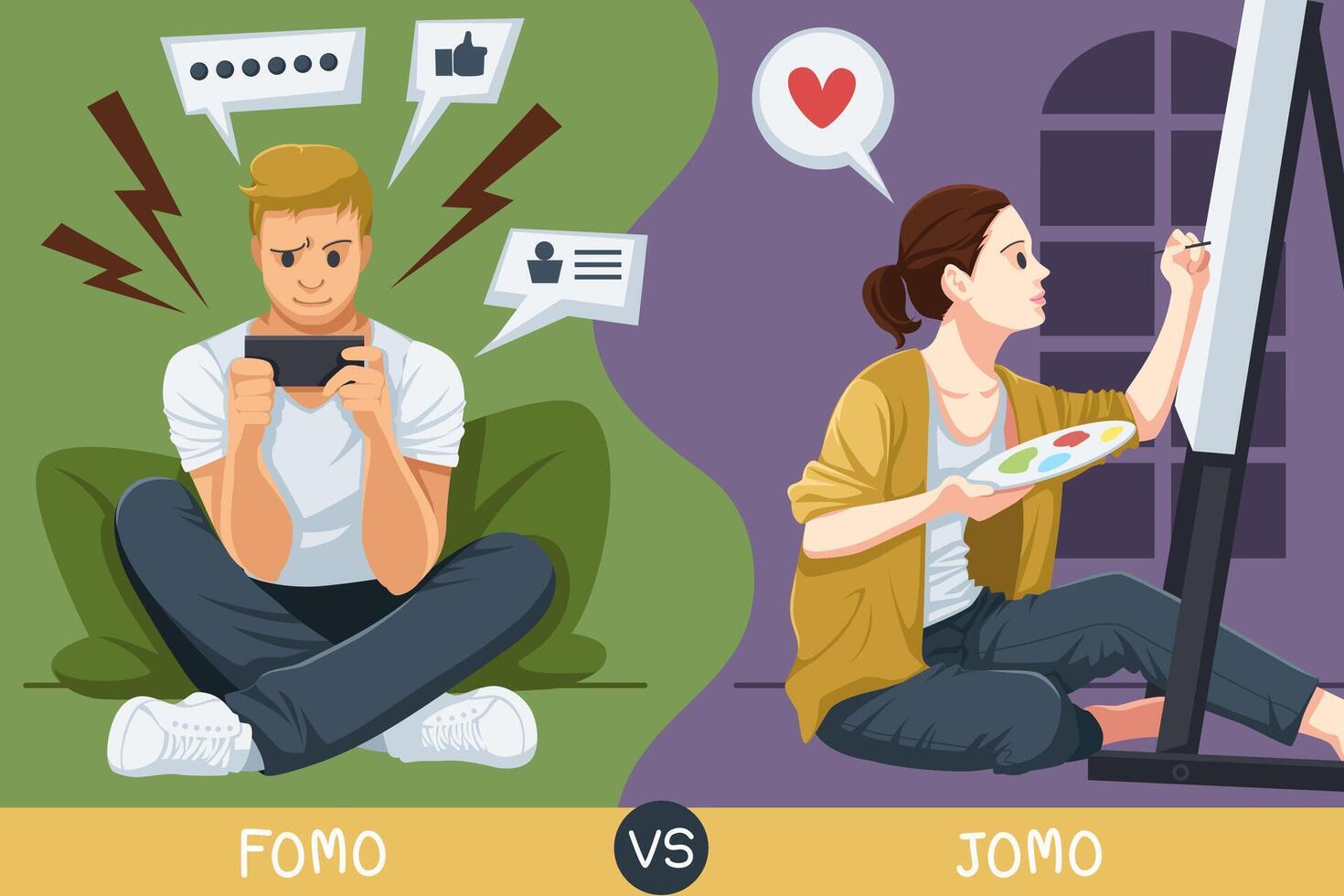 Fomo and Jomo concept. fear of missing out, joy of missing out Pro Vector