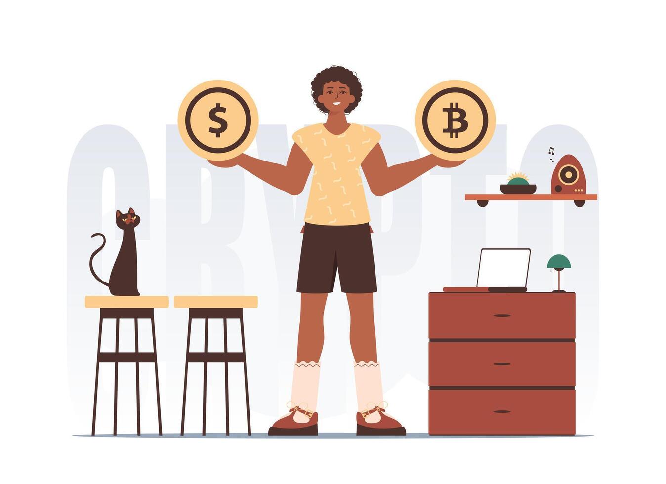 Cryptocurrency concept. A man holds a bitcoin and a dollar in the form of coins in his hands. Character with a modern style. Pro Vector