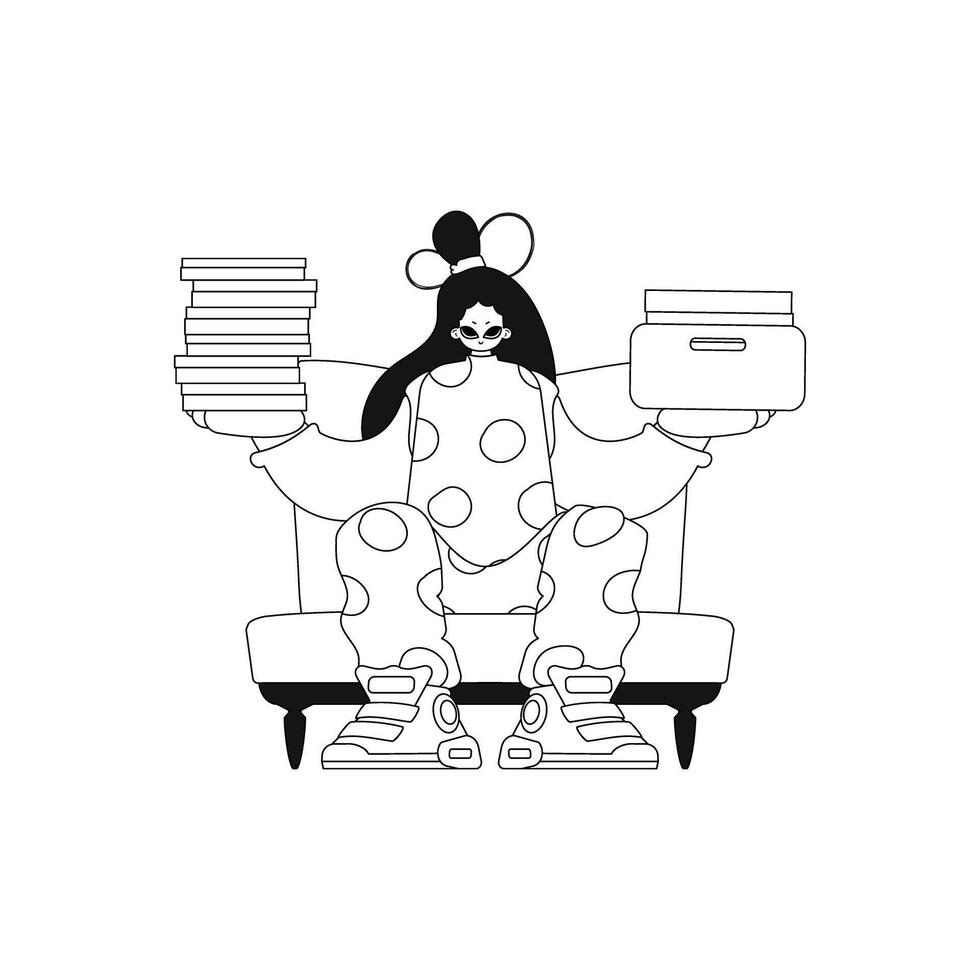 Girl holds multiple stacks of files. Drawn in linear style. art. Pro Vector