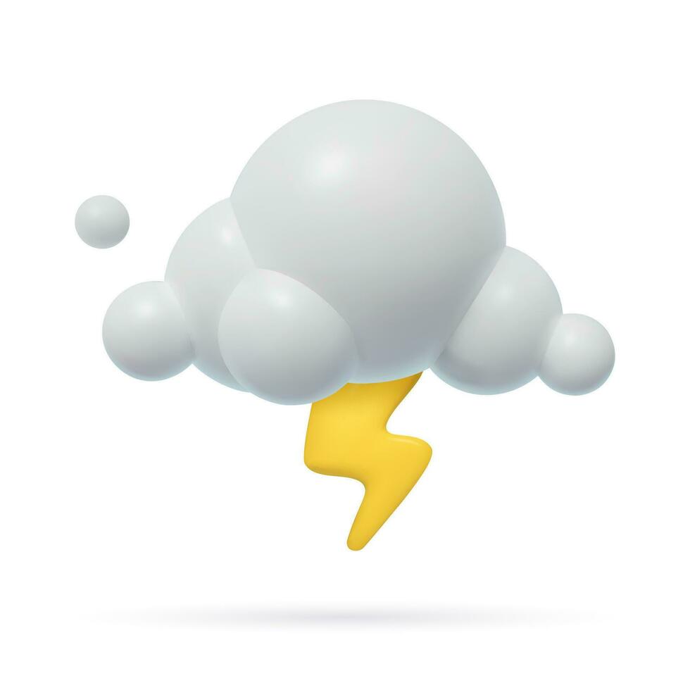 Cloud and thunder 3d icon. Realistic three dimensional illustration of storm with lightning. Plastic weather design element. Pro Vector