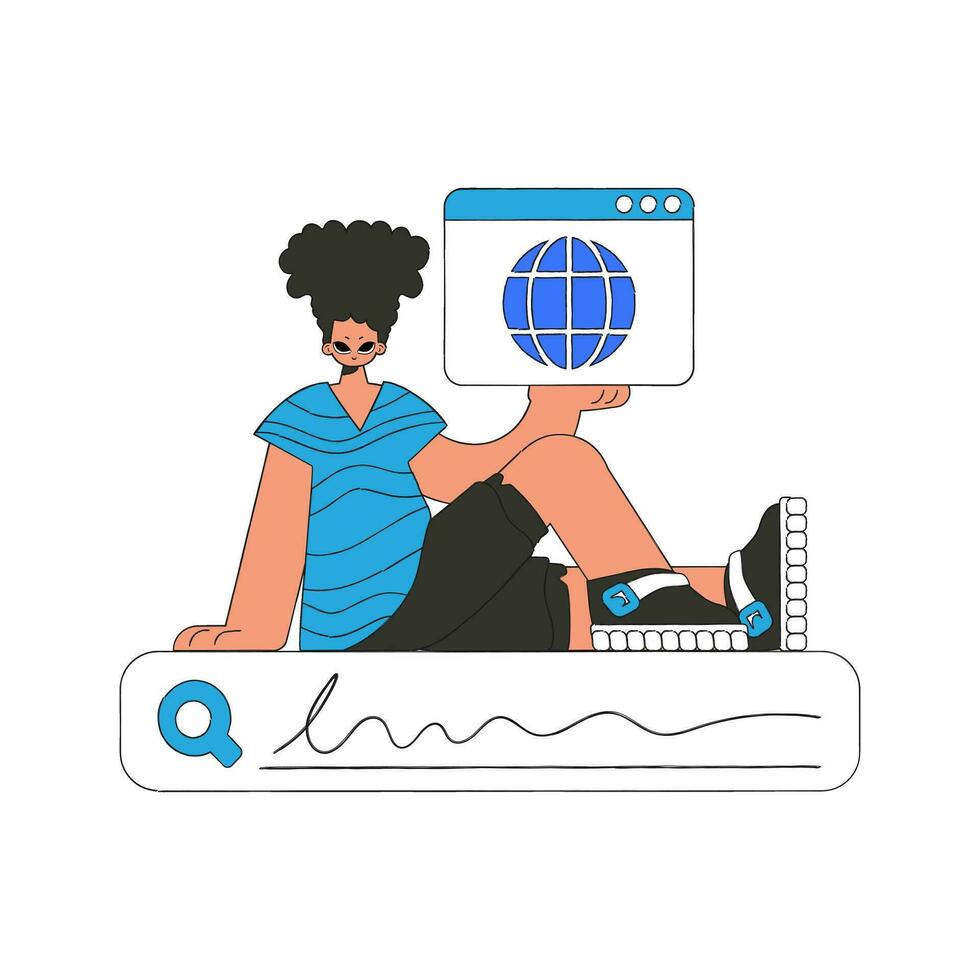 A man sits on a search bar and holds a browser window in his hands. Search for information. Linear retro style character. Pro Vector