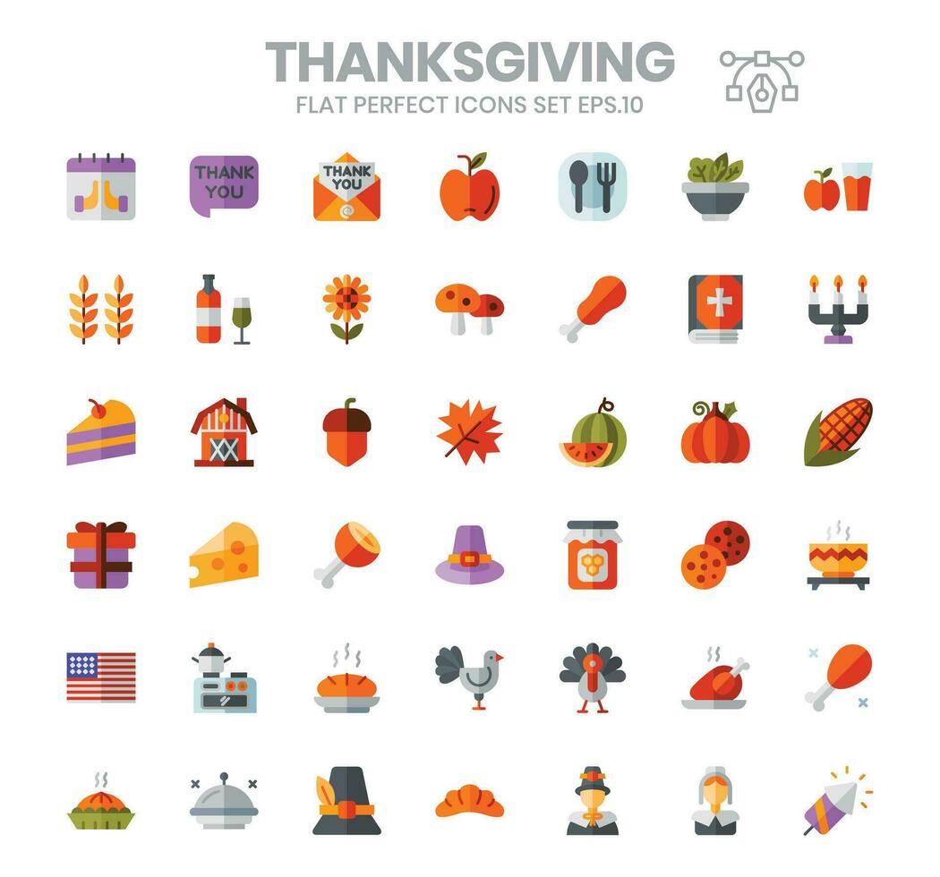 Thanksgiving flat icons set. The element collection includes be used in social media posts, web design, app design, and more. Pro Vector