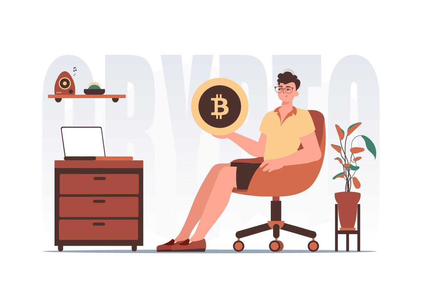 The concept of mining and extraction of bitcoin. The guy sits in a chair and holds a bitcoin coin in his hands. Character with a modern style. Pro Vector