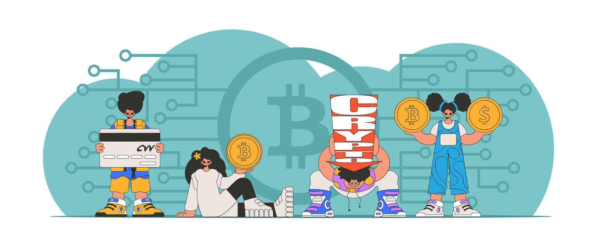 The concept of managing interaction with digital monetary assets. a group of people interact with bitcoin. Pro Vector