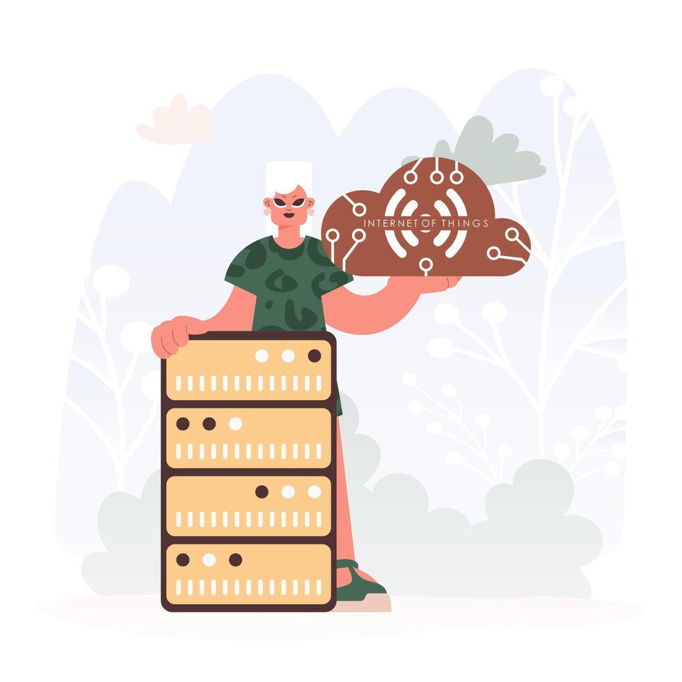 Energetic lady Getting a handle on the IoT Picture Inside parts the center of a Organize of Servers, Symbolizing the Interconnectivity and Mechanical Headways of Advanced Times. Pro Vector