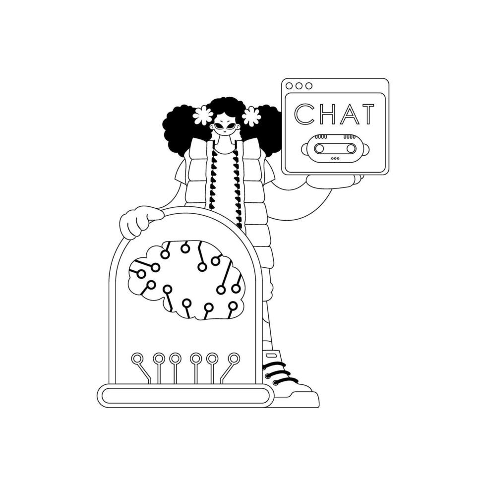 Girl grasps AI model, a linear image in vector form Pro Vector