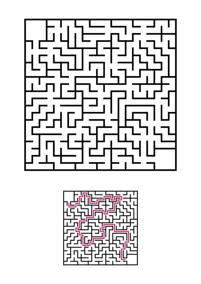 Abstract square maze. Game for kids. Puzzle for children. One entrances, one exit. Labyrinth conundrum. Simple flat vector illustration isolated on white background. With answer. Pro Vector