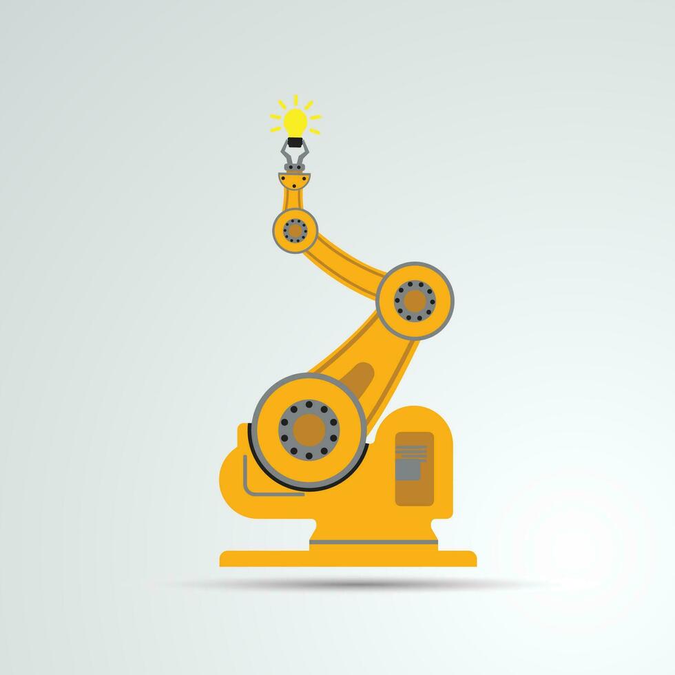 a robot arm is holding a light bulb. illustration of getting ideas for inspiration through robots or artificial intelligence Pro Vector