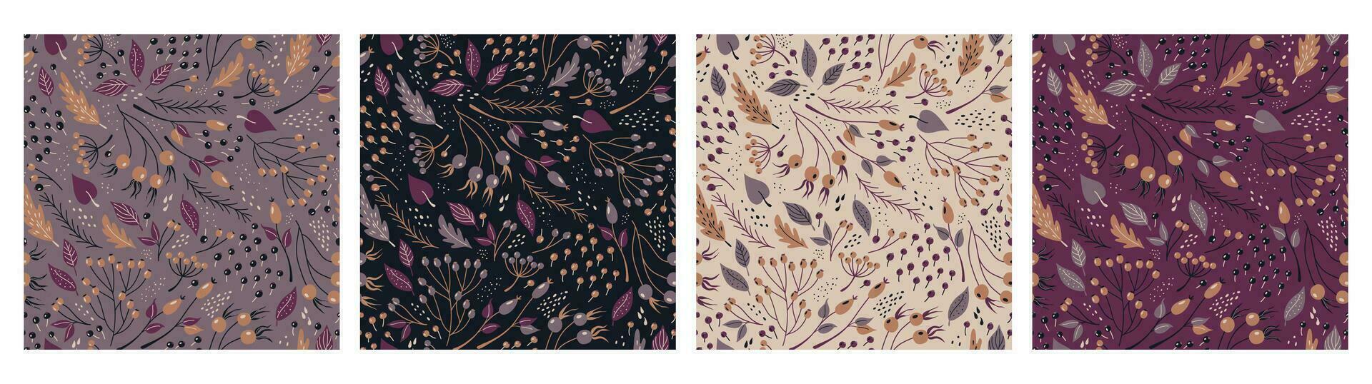 Seamless patterns with autumn plants. Set of retro backgrounds with fall leaves, berries and tree branches. Vector illustrations of abstract forest. Pro Vector