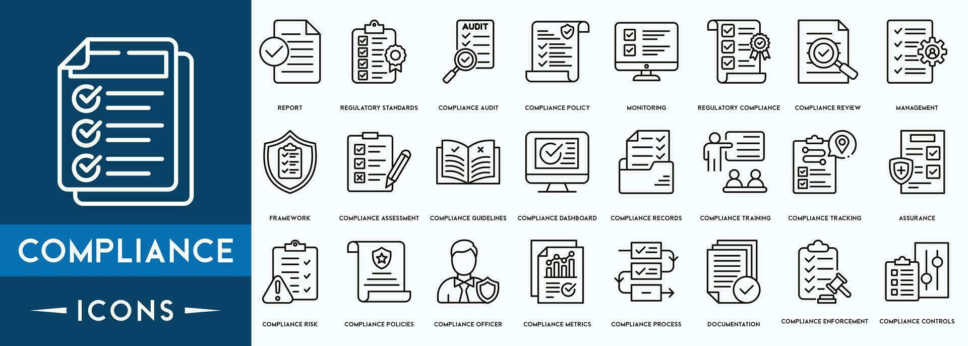 Compliance icon set. Checklist on the clipboard line icon with checkmarks, checklist, document, gear, Review, Compliance Management, Framework, Assessment outline icons. Pro Vector