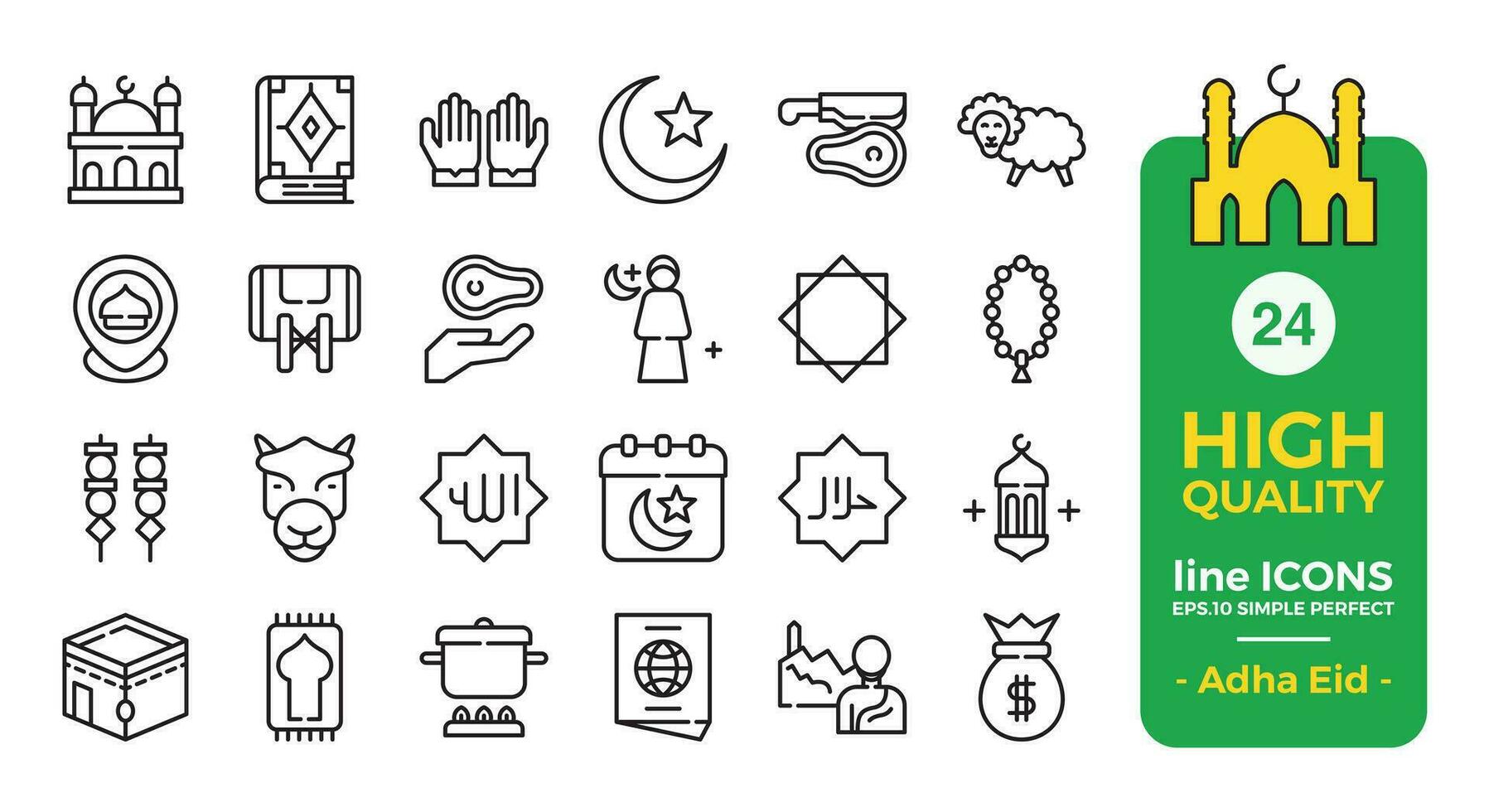Eid Al Adha thin outline icon set . The collection includes web design, application design, UI design, during Eid Al Adha, Eid al Fitr, and others. vector