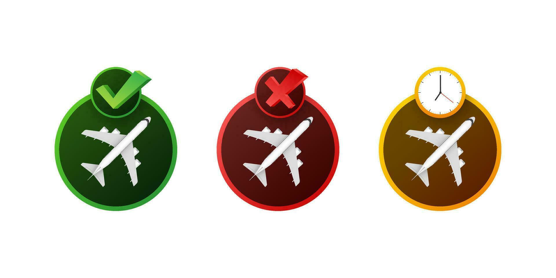 Flight information check mark. Qr code scan icon. Exclamation mark. Travel time Pro Vector