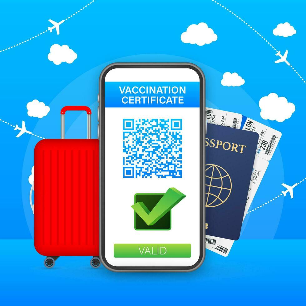 Vaccination digital certificate on smartphone with suitcase and passport. Phone screen with qr code and pass check mark vaccinated. Health passport. Vector stock illustration Pro Vector