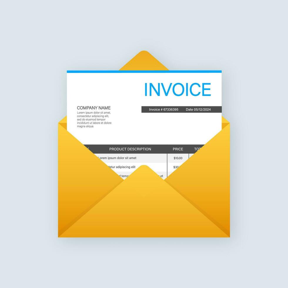 Invoice icon vector, email message received with bill document, flat style open envelope with invoice paper blank. Pro Vector