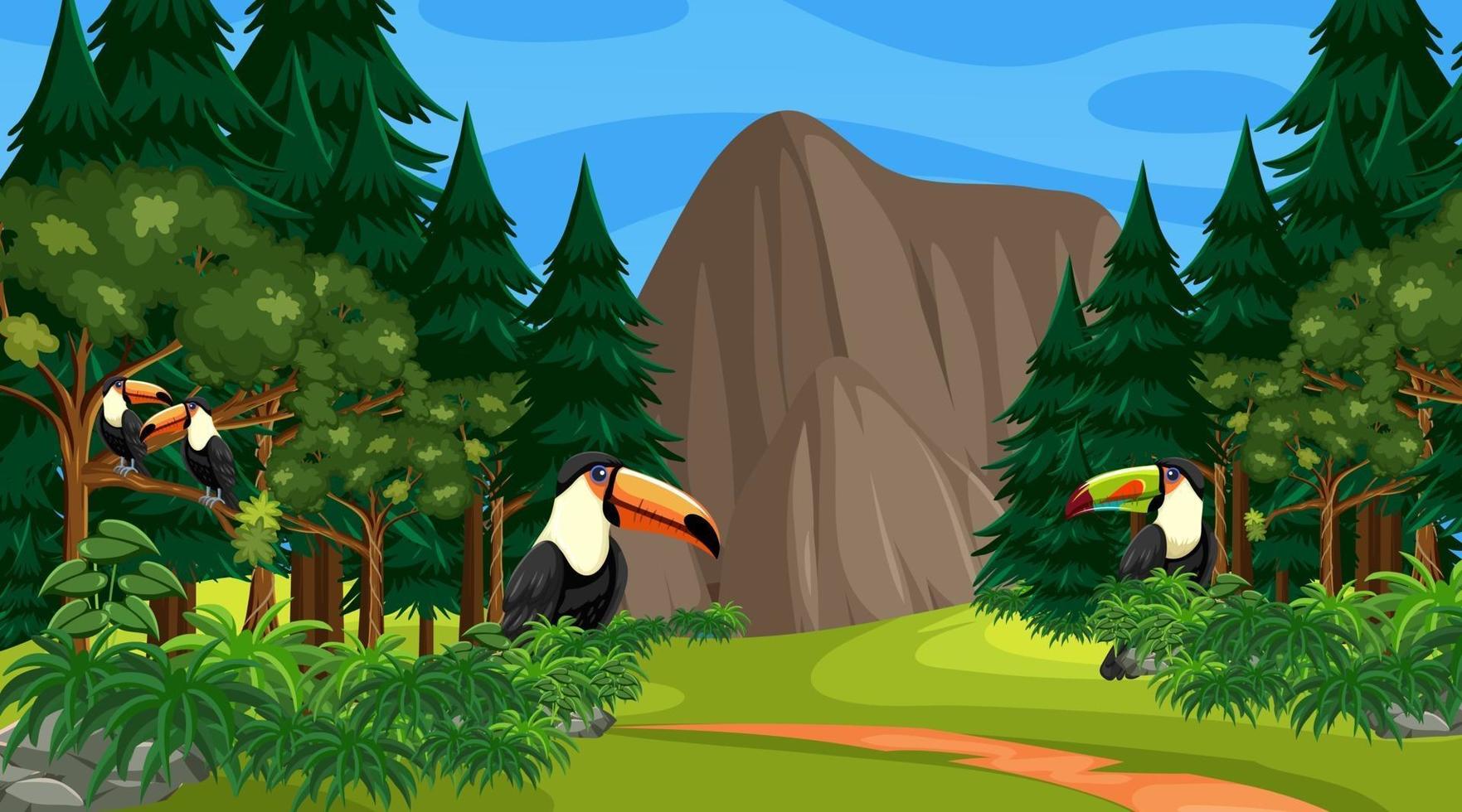 Many toucan birds in forest or rainforest scene with many trees Free Vector