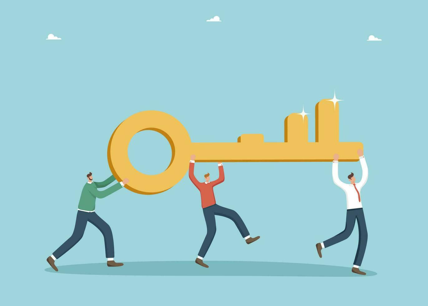 Thinking to find ways out of difficult situations, secret key to generating brilliant ideas, teamwork and brainstorming to create innovations and business development strategy, men carry key. Pro Vector