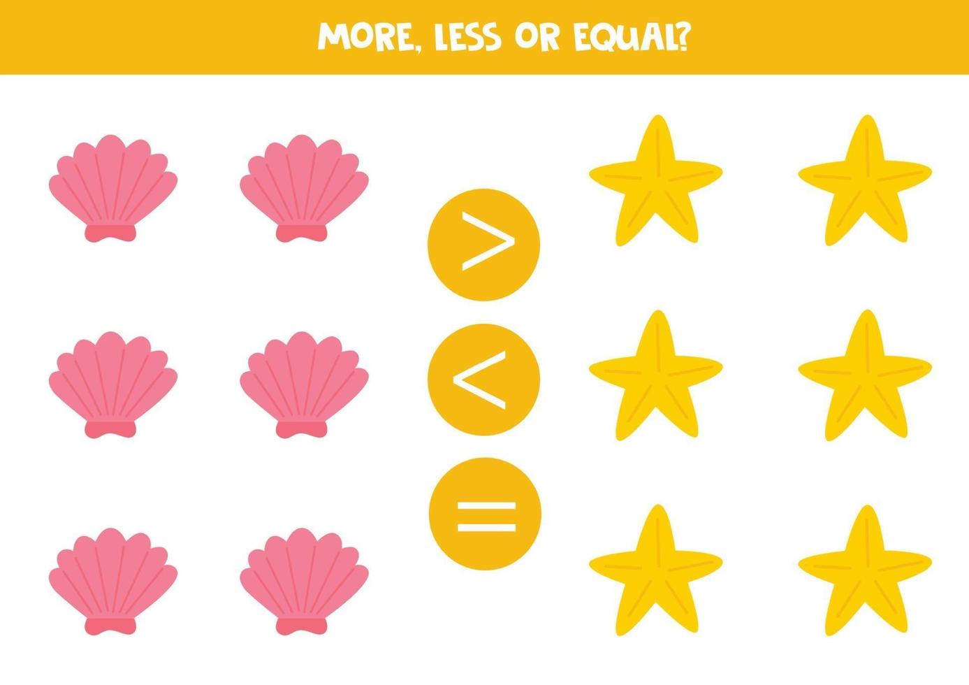 More, less, equal with starfish and seashell. Math comparison. Pro Vector