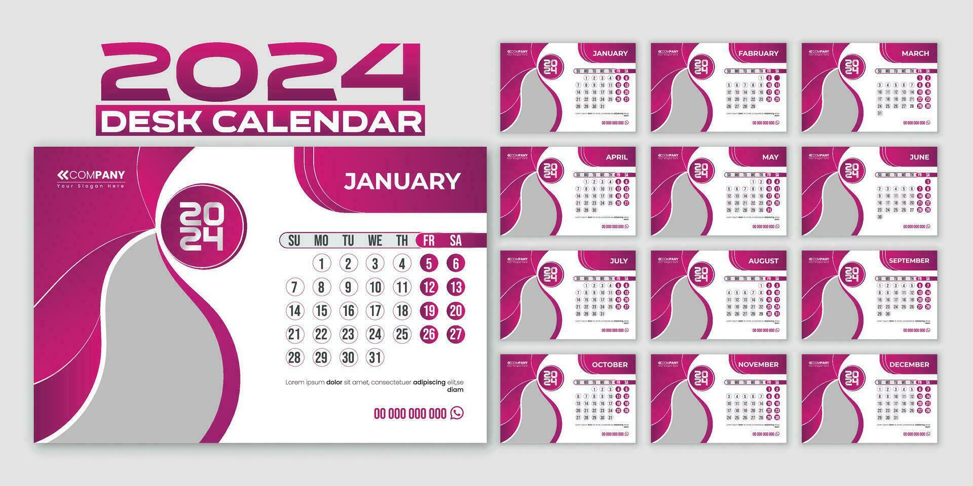 2024 desk calendar with 12 pages, abstract gradient shapes, and an image placeholder. Pro Vector