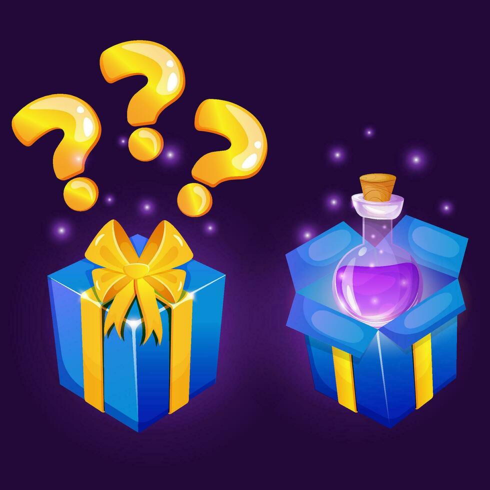 Close and open gift box with magic potion as a reward, game ui interface element Pro Vector