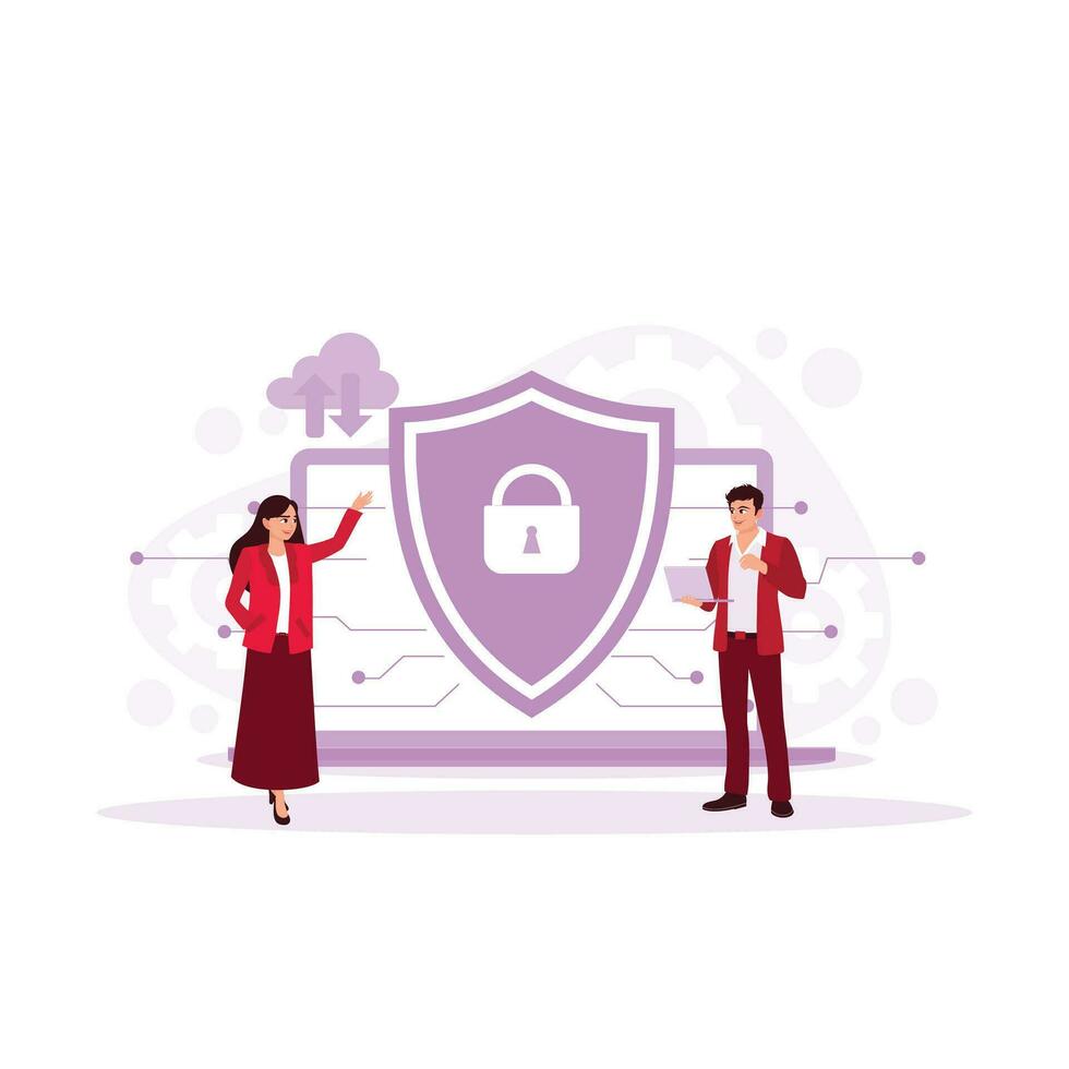 IT experts use laptops to store data and access privacy and cybernetics security services. Pro Vector