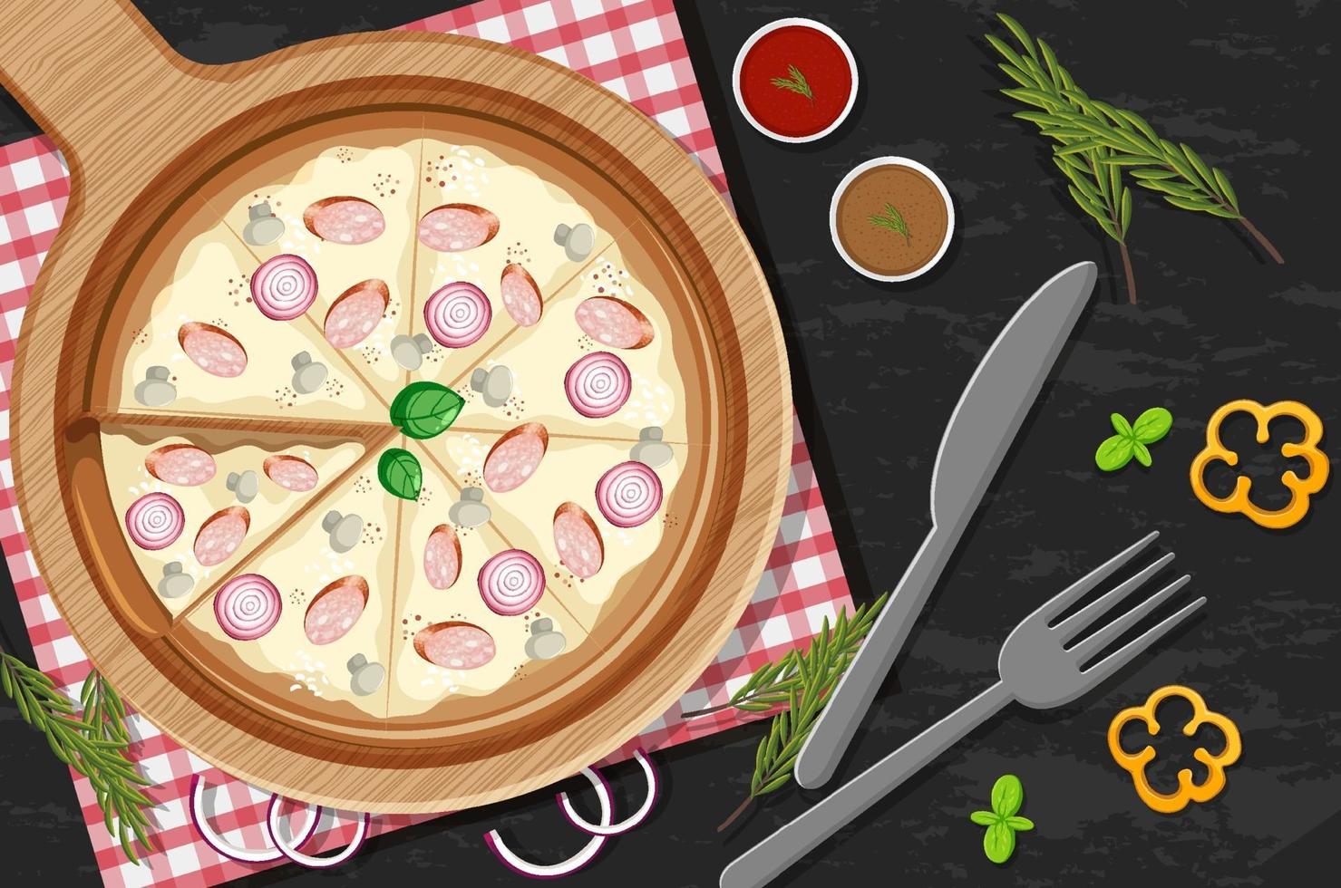 Top view of a whole pizza with onion and mushroom topping on the table vector