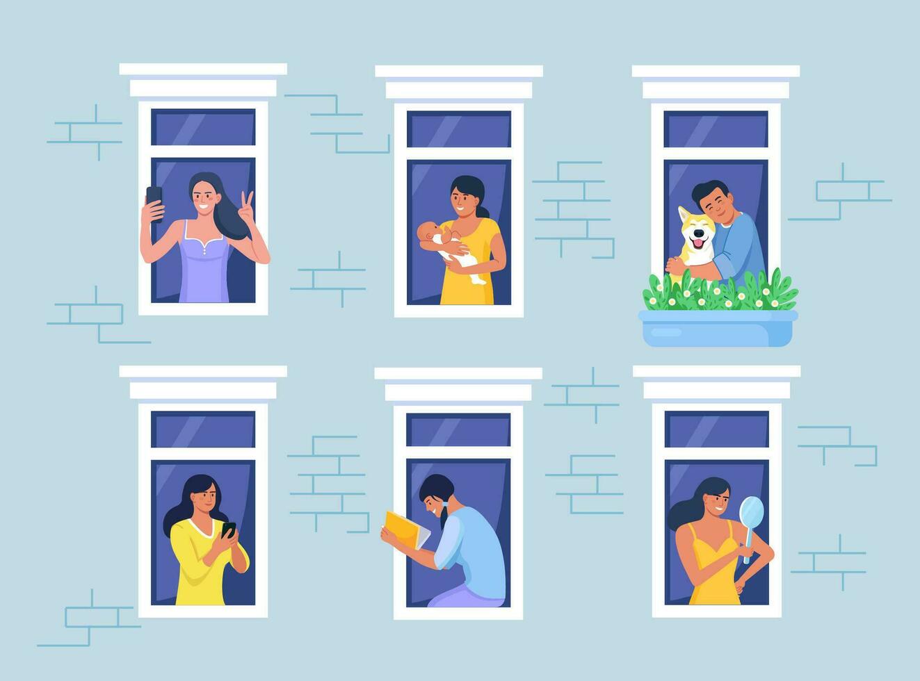 Outer wall of house with neighbors and dog at windows. Happy men and women look out of apartments reading, take photo, chatting with phone, hugging, holding child. Stay home, daily routine activity Pro Vector