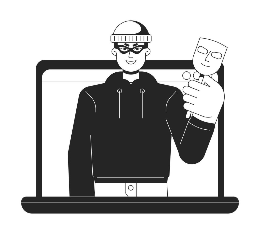 Phishing cybercrime bw concept vector spot illustration. Cyberattack on personal data and identity 2D cartoon flat line monochromatic character for web UI design. editable isolated outline hero image Pro Vector
