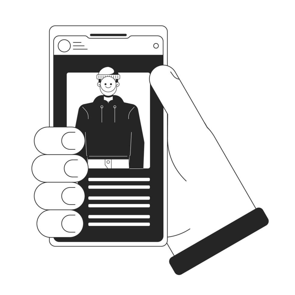 Stealing identity smartphone bw concept vector spot illustration. Cybercrime. Hacker personality theft 2D cartoon flat line monochromatic hand for web UI design. editable isolated outline hero image Pro Vector