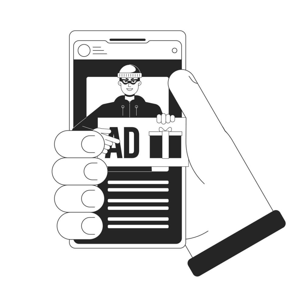 Advertising fraud on smartphone bw concept vector spot illustration. Thief stealing data. Click on ad 2D cartoon flat line monochromatic hand for web UI design. editable isolated outline hero image Pro Vector