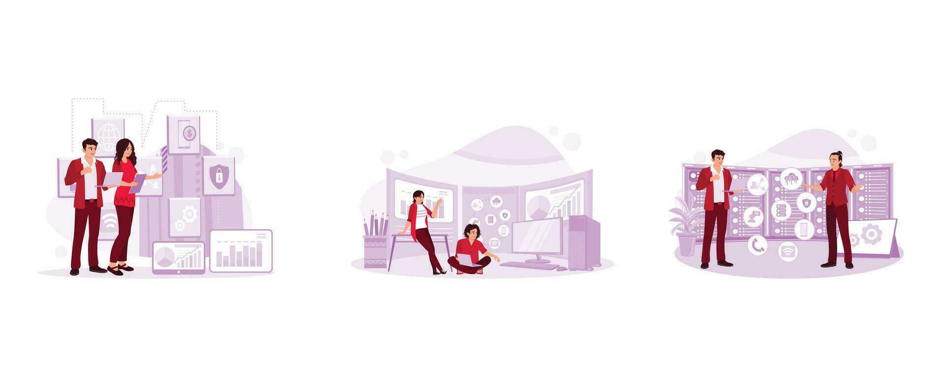 Information storage. Two little programmers are in front of a big computer screen. Server maintenance. Formation Technology concept. Set Trend Modern vector flat illustration Pro Vector