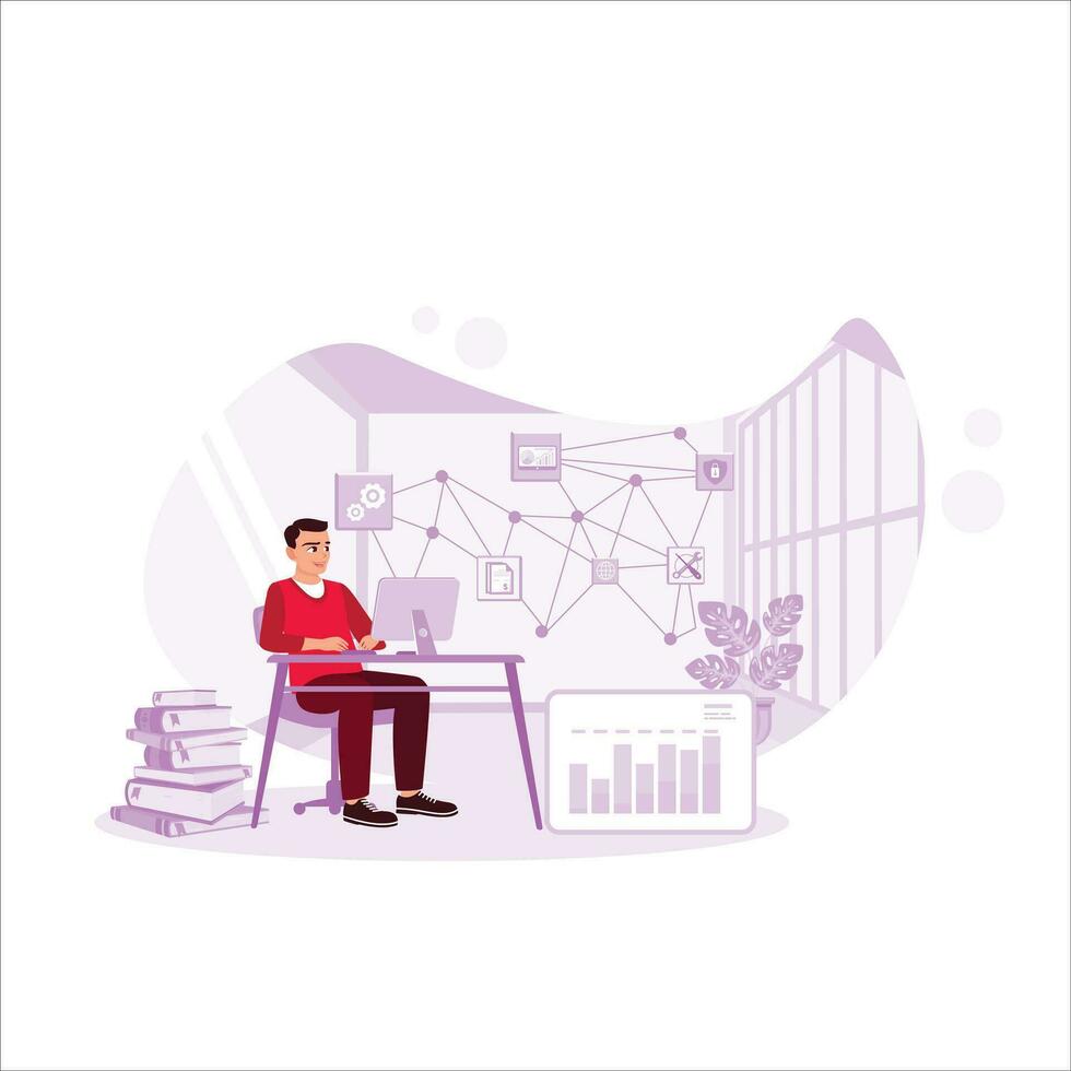 System Administration and Machine Learning Engineer Programming at the Workstation. Brain with digital circuits and programmer with artificial intelligence. Trend Modern vector flat illustration Pro Vector