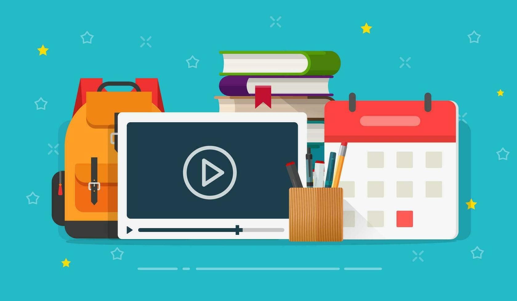 Online courses or webinar training vector illustration, flat cartoon video player and educational stuff, backpack, calendar and pens, idea of distant tutorial study or preparing to exam date, learning Pro Vector