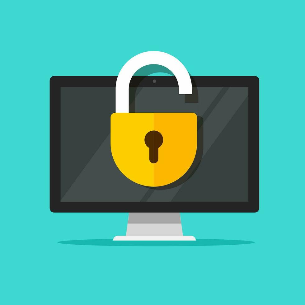Computer lock open on display vector illustration, flat cartoon pc screen with open padlock icon, authentication or crime symbol, unlocked security or breaking open privacy image Pro Vector