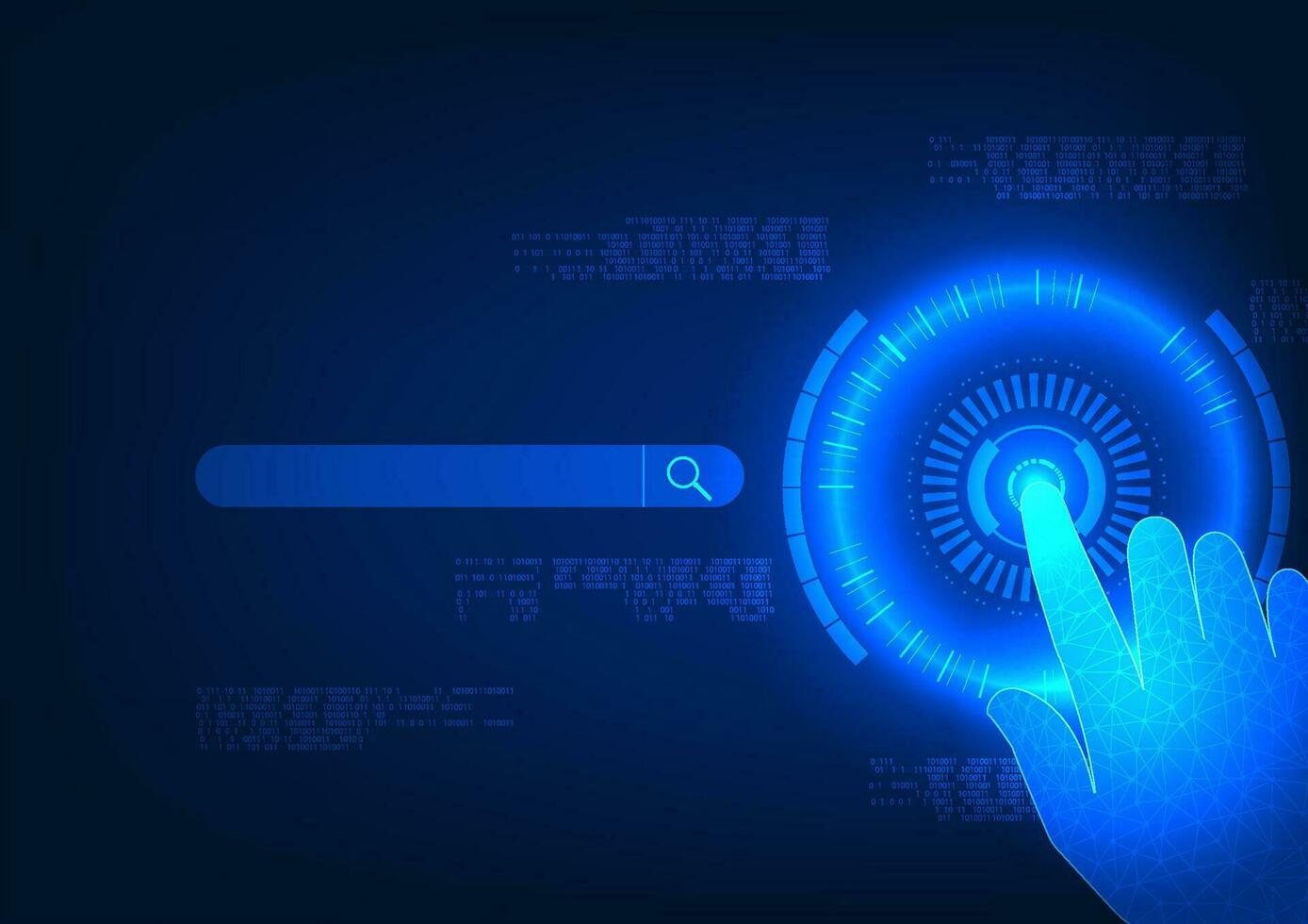 Information search technology Hand pressing a technology circle button with a search box It means searching for information and ideas via the internet system Pro Vector