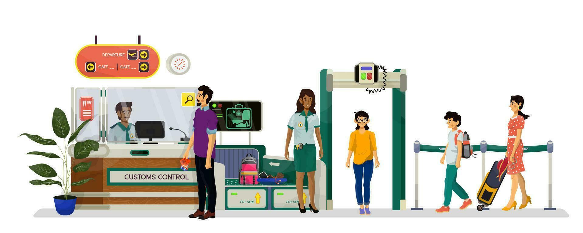 Flat illustration of customs and immigration control with queue in airport on a white background. Pro Vector