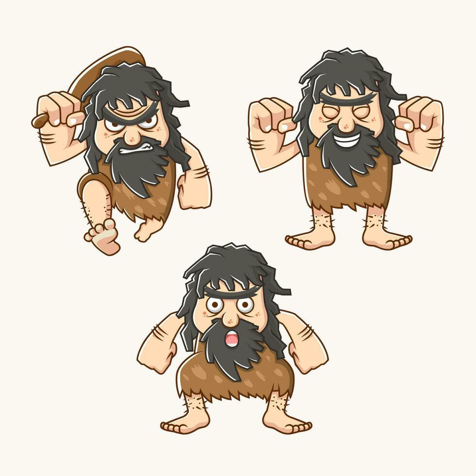 set character of a cave man in stone age with different style, facial expression and carrying bat vector illustration Pro Vector