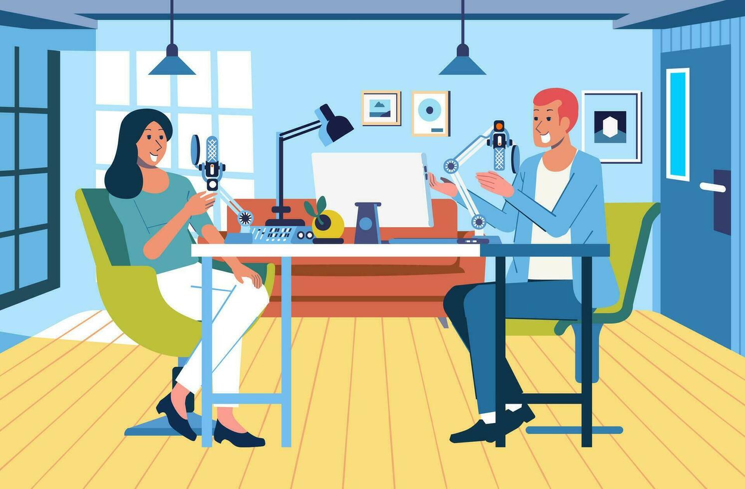 radio interview between announcers and sources in the studio, modern studio interior vector illustration Pro Vector